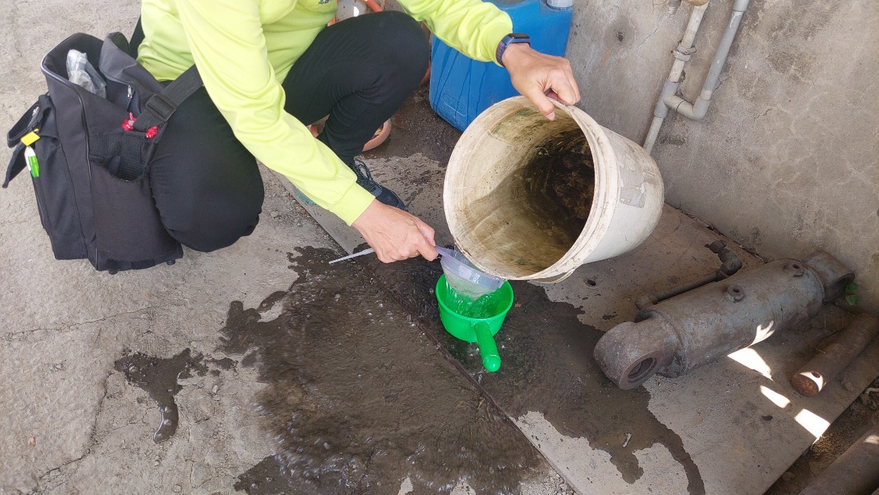 防疫團隊今(15)日針對個案居住地半徑100公尺室內外同步地毯式孳生源檢查及化學噴藥防治等緊急防治工作。昨(14)日經防疫人員巡檢查獲社區內有多處孳生病媒蚊的陽性容器,包括輪胎、水桶(4個)、塑膠布皺褶、棧板、飼料盒等都有孳生病媒蚊孑孓,並針對違規者處新臺幣1,200元罰鍰。