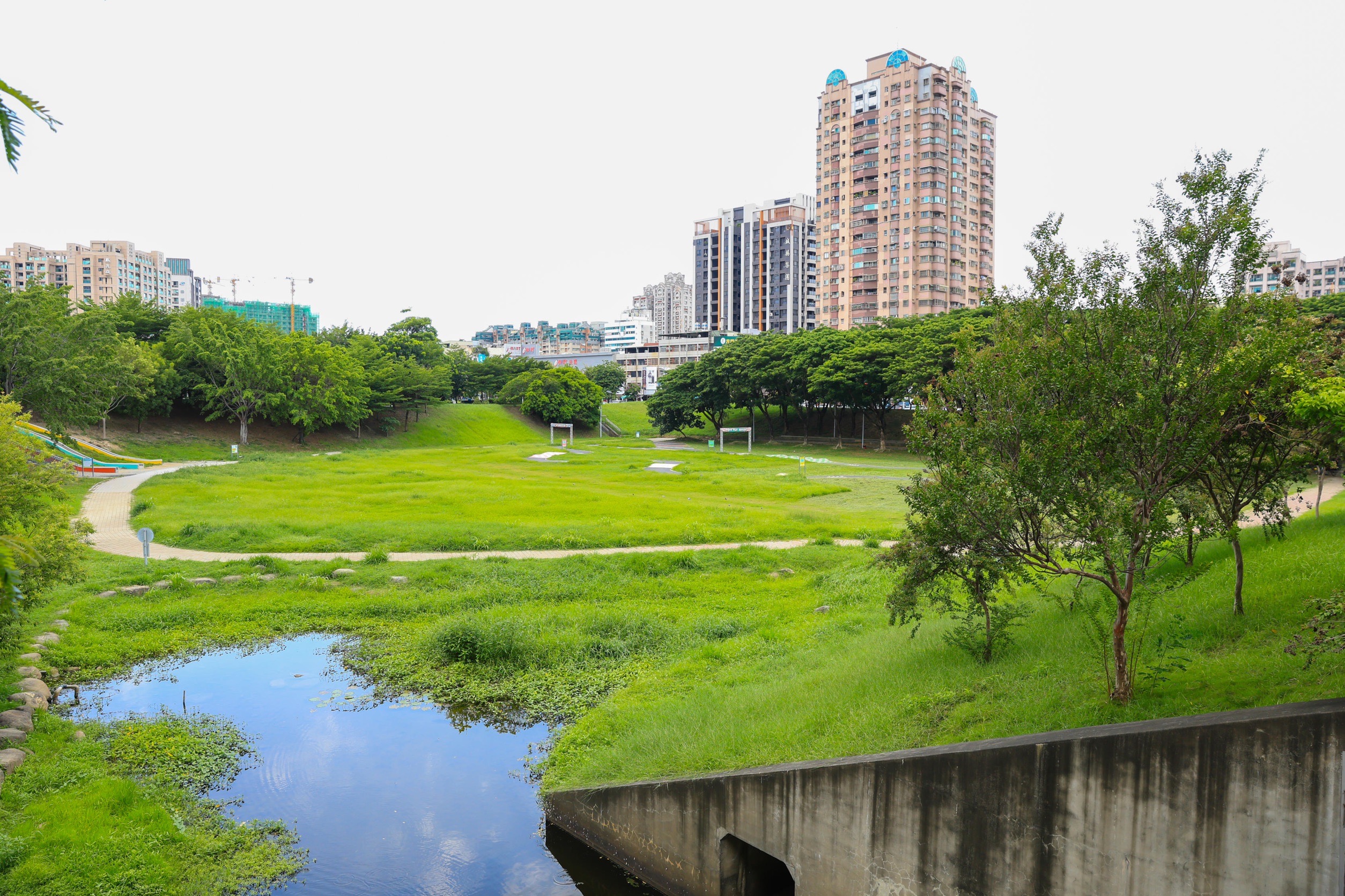 高市府表示,計畫範圍內並不屬於淹水潛勢區,但市府仍採嚴謹保守之出流管制規劃,設計45,672立方公尺之滯洪池,不僅比雨水下水道規劃報告要求的有效滯洪體積更高,綠地公園亦未曾縮減,該出流管制規劃經審核通過,未來將尊重排水紋理、拓寬道路、新增步道、改善人車通行動線、檢討閒置設施串聯整合綠鋪面後,綠地將擴大至約10.46公頃,較現有綠地提升1.9倍。