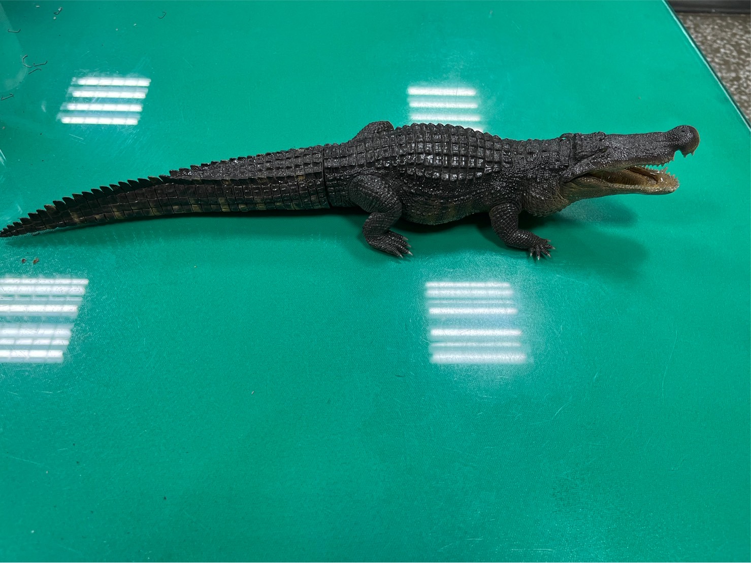 高雄一名男子自導自演,將鱷魚模型放置在凹仔底公園拍照,並發文散佈引起民眾恐慌。(高雄市鼓山警分局提供)