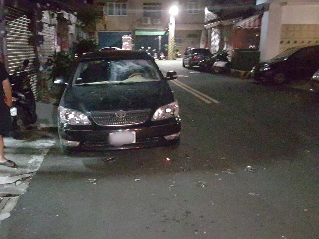 嫌疑人因漏水問題與鄰居發生口角,半夜木棍敲擊被害人停放於自家門口自小客車,造成車輛之擋風玻璃、車窗與引擎蓋毀損。(高雄市前鎮警分局提供)