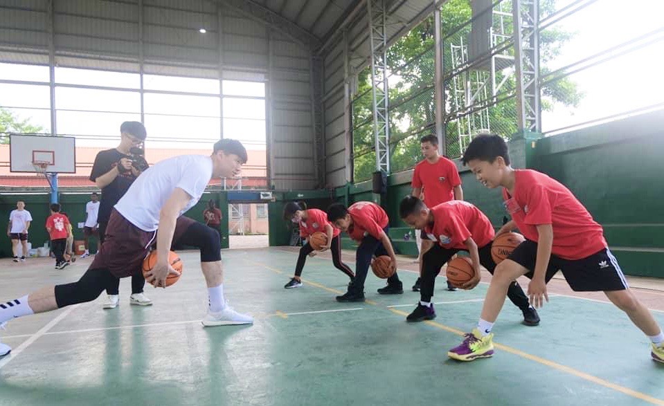 籃球課程就在球員與學生進行傳球、投籃與防守的律動中開始,學生在球員的帶領下,從各種運球動作的模仿開始,逐漸感受肢體的律動與節奏,一步步練習傳球、投籃,一個半小時的課程中,學生大汗淋漓卻笑容滿面,從陌生到熟悉,從緊張到自信,球員動作解析與悉心帶領功不可沒,在場貴賓、師生與家長不時響起掌聲為學生們加油打氣。