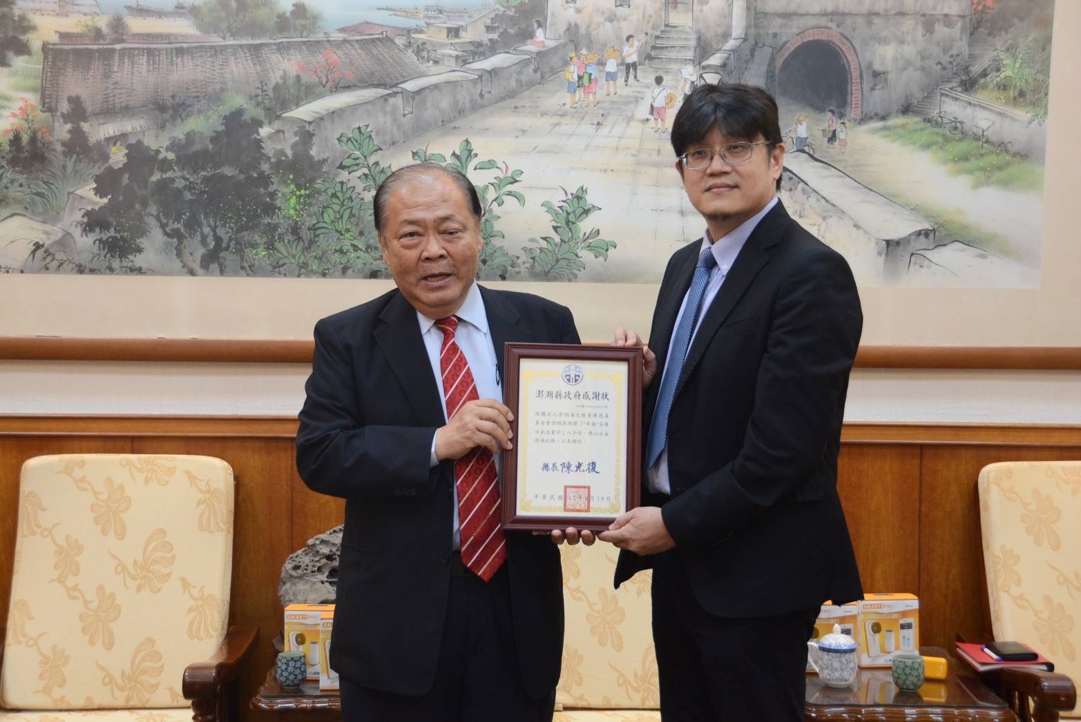 (記者李麗華報導)澎湖海慈善基金會董事長黃凱文捐贈80台吐氣流量計。陳光復頒發感謝狀感謝來自社會源源不斷的善心,協助提升澎湖醫療環境,提供民眾更現代便利的醫療器材。