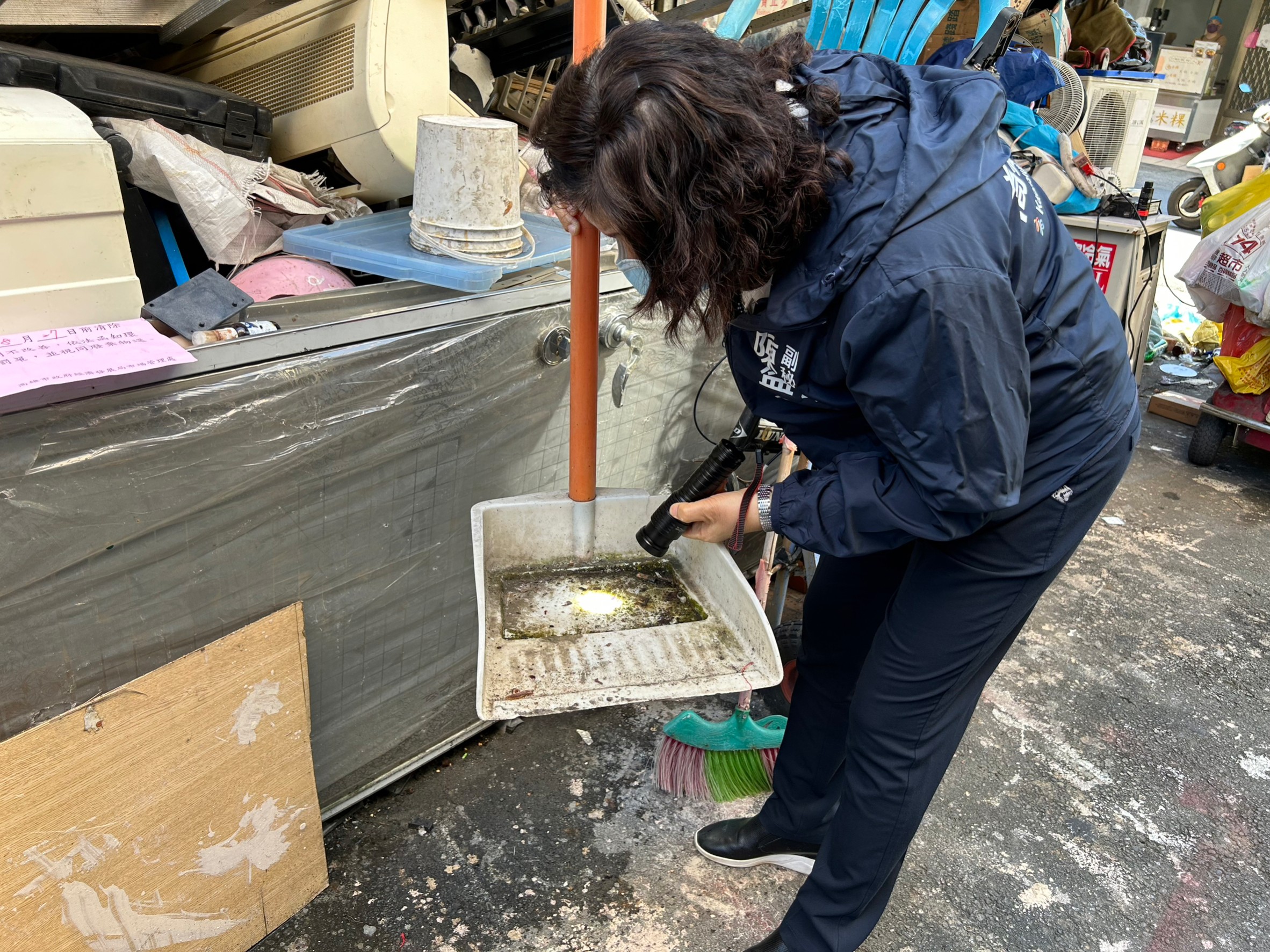 高雄市進行大寮區後庄、中庄、忠義、江山4里聯合環境大掃蕩,由市府陳盈秀副秘書長率防疫團隊及大寮區里鄰長、志工針對高風險場域孳生源巡查、清除髒亂點。(高雄市衛生局提供)