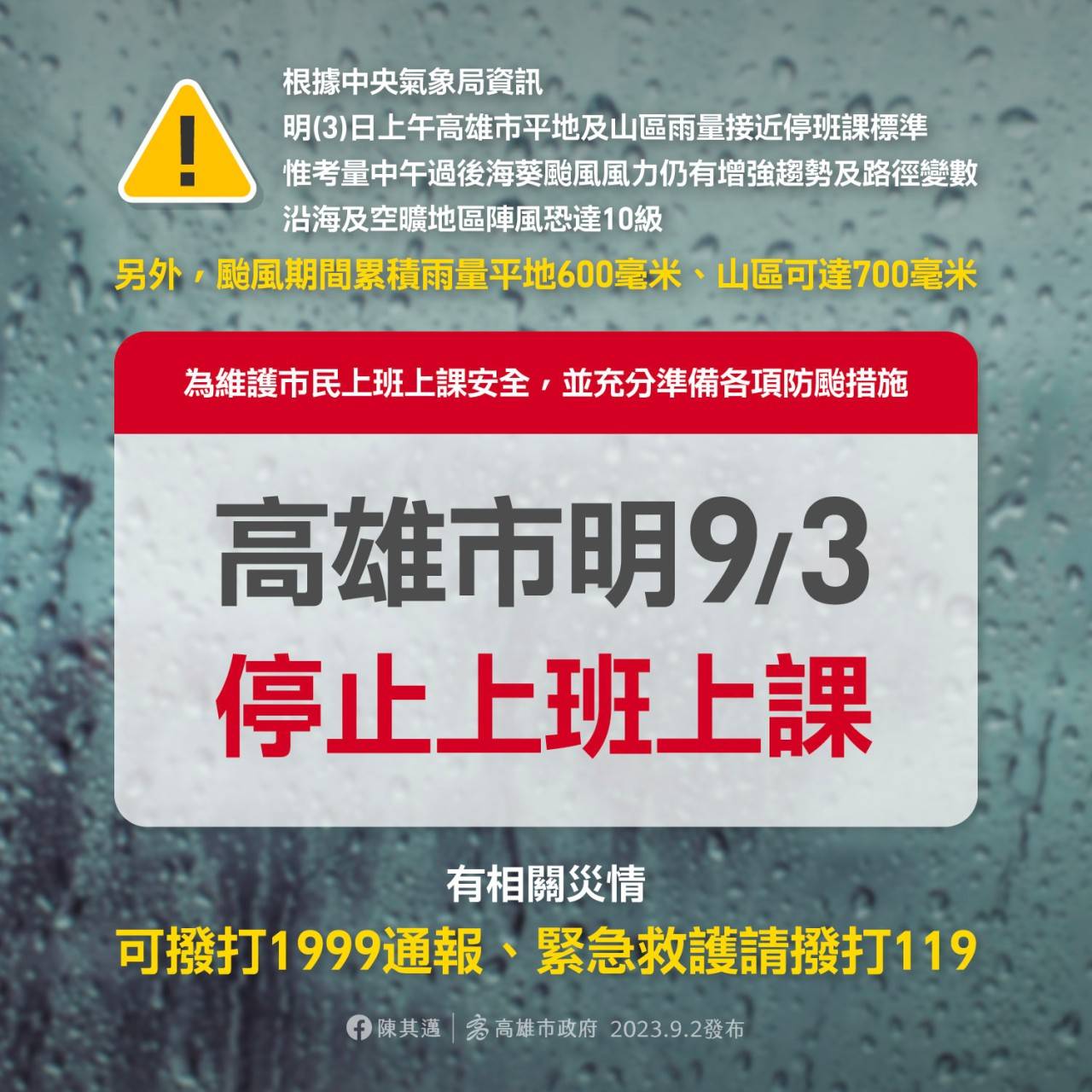(記者蘇小刀報導)根據中央氣象局資訊,明(3)日上午高雄市平地及山區雨量接近停班課標準,惟考量中午過後海葵颱風風力仍有增強趨勢及路徑變數,沿海及空曠地區陣風恐達10級。另外,颱風期間累積雨量平地600毫米、山區可達700毫米,為維護市民上班上課安全,並充分準備各項防颱措施,高雄市明(3)日停止上班及上課。