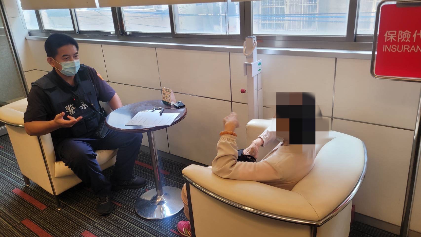 婦人稱朋友介紹她網路投資股票公司,低風險高獲利,對方要求其匯款,婦人前往銀行欲匯款新台幣10萬元,行員查詢受款帳戶有異,通知警方到場。(高雄市鳳山警分局提供)