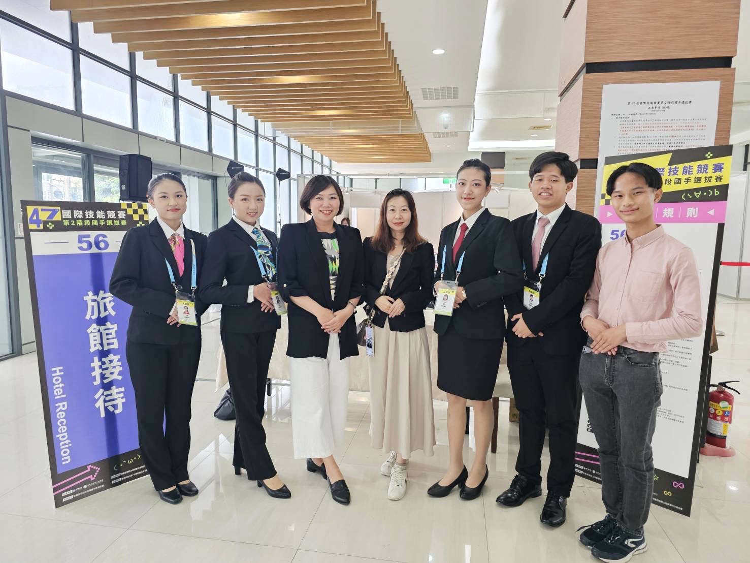 其中服裝科服裝創作孫謦、許芯瑜;觀光科旅館接待賴楷婷、林姮妤、黃姸綾參加此次競賽,取得角逐國手賽門票;校長王雪娥鼓勵學生們專心練習,以平常心穩紮穩打面對壓力挑戰。