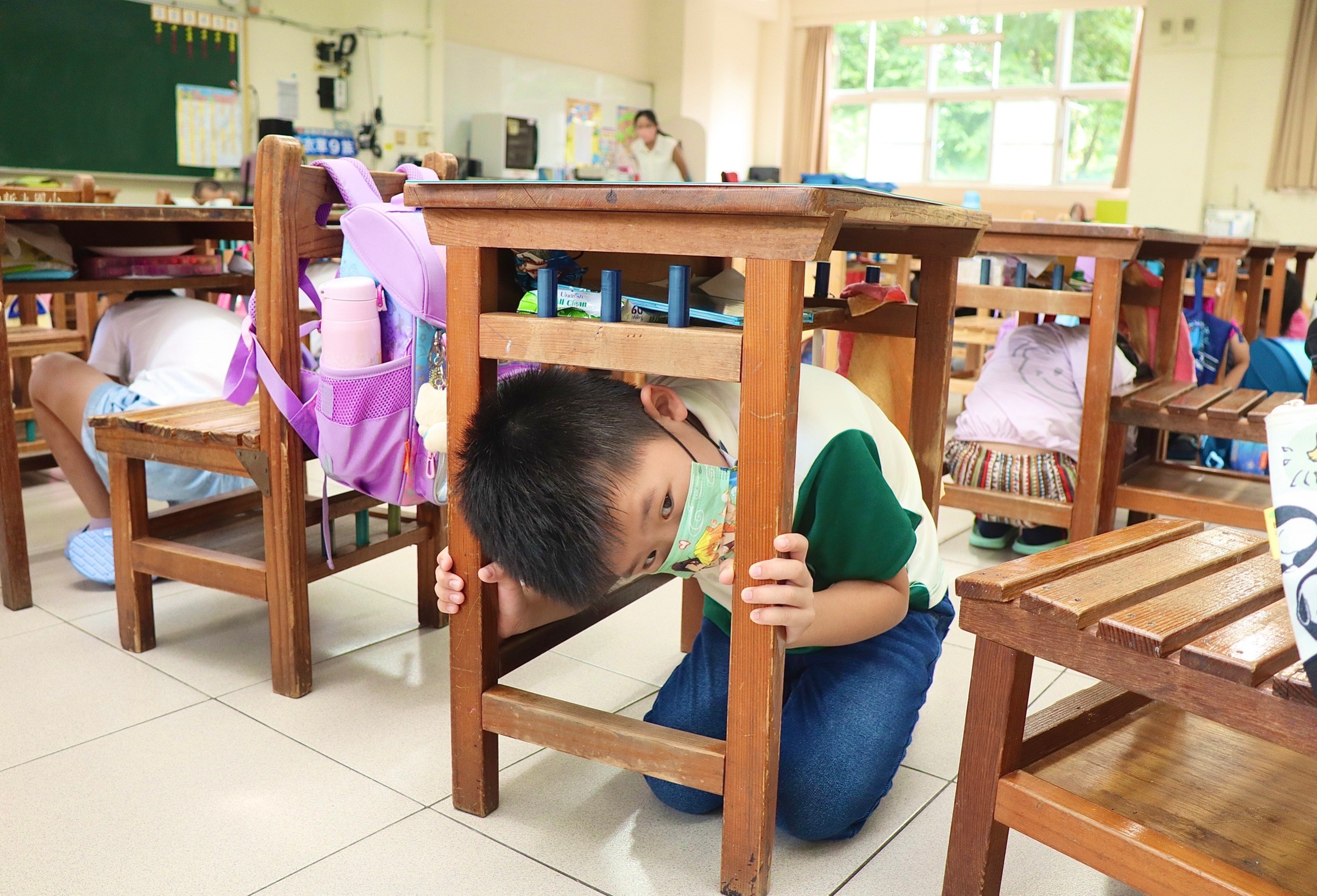 當9:21分警報聲響起,現場學生們立刻趴在教室桌椅底下,緊抓桌角、護著頭部;之後有的同學拿桌墊、有的拿書本、也有同學戴上安全帽護著頭部,幼兒園小朋友也戴上紅色護頭頸套,迅速下樓疏散到空曠的操場。
