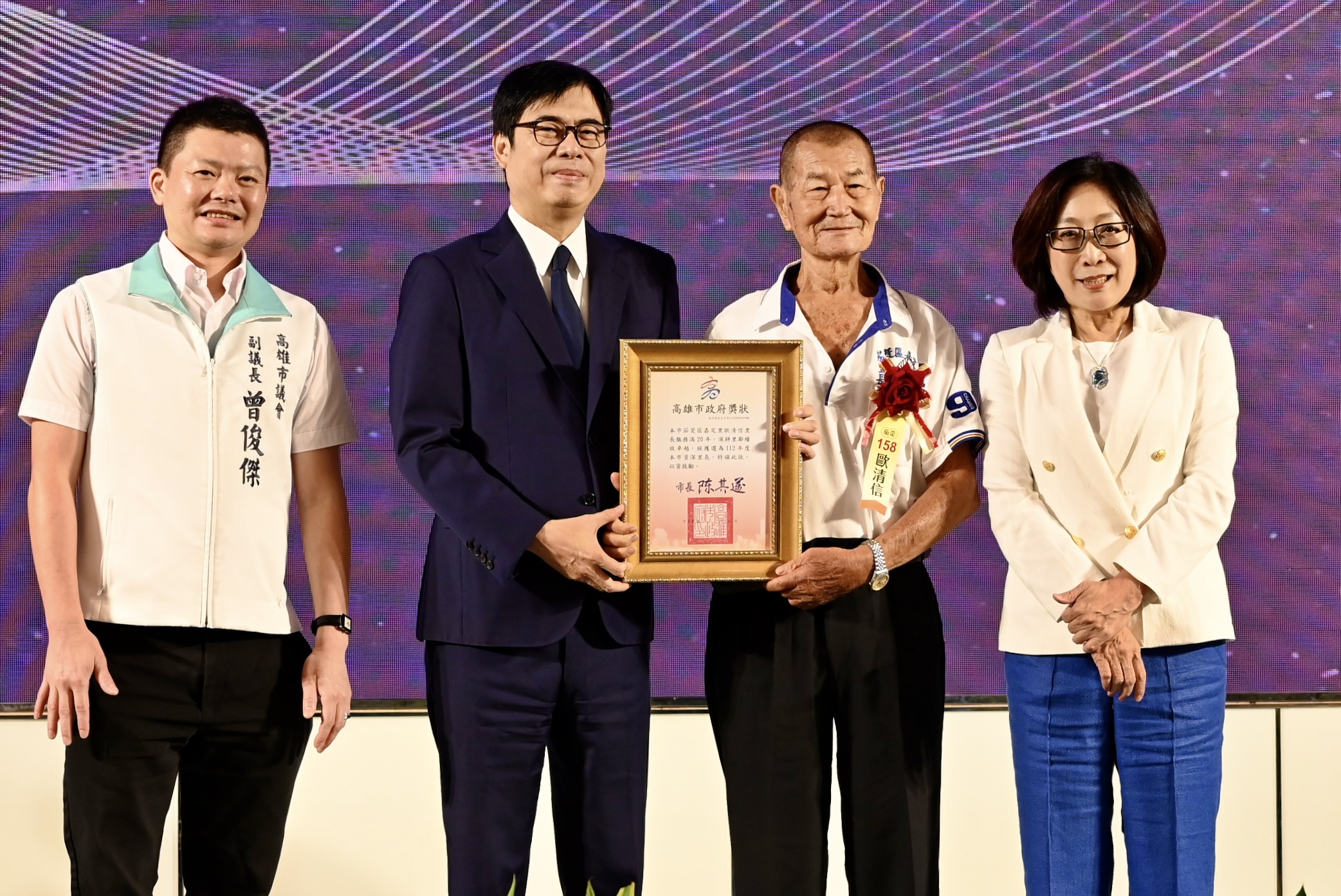 高市府今(22)日舉行「高雄市112年特優暨資深里長表揚大會」,由市長陳其邁、議長康裕成、副議長曾俊傑以及在地議員逐一與得獎里長頒獎合影。陳其邁感謝里長們在地方上的付出,他說里長是地方的土地公、市府的好幫手,照顧著鄰里,尤其近年在防疫、登革熱防治、住警器發放等事務,感謝里長們都全力配合市府的相關政策,市府也配合物價調整鄰里長的文康費用,盼能予在第一線為民服務的鄰里長照顧。