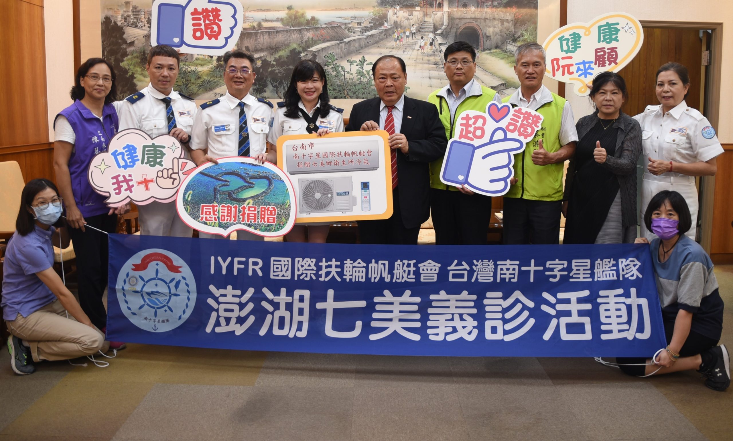 澎湖縣長陳光復22日公開表揚並頒發感謝狀予台南市南十字星國際扶輪帆艇會,感謝其共同募集捐贈七美衛生所四台冷氣設備,改善離島鄉親就醫環境。