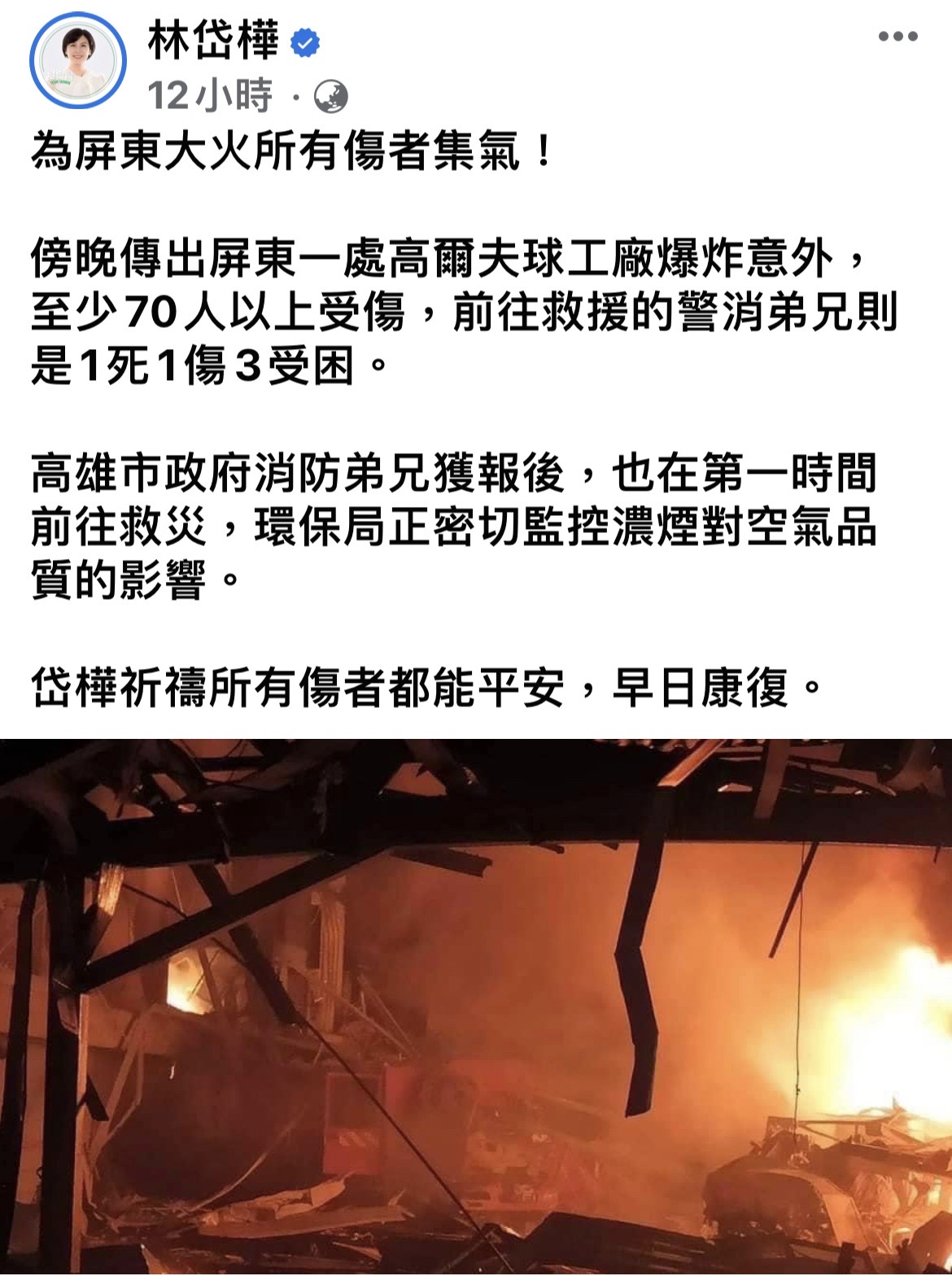 (記者黃思慈報導)昨日傍晚,屏東市經建路上科技產業園區內一間生產高爾夫球設備工廠,疑發生爆炸事故,消防人員到場救援後,裡面有天然氣,消防人員現場進去時發生爆炸,截至23日08:00,消防4人殉職、百人輕重傷送醫,還有失聯民眾,現在持續搜救中。立委林岱樺出席中華民國消防設備師公會全國聯合會時強調,未來一定會更重視消防設備人員保障。