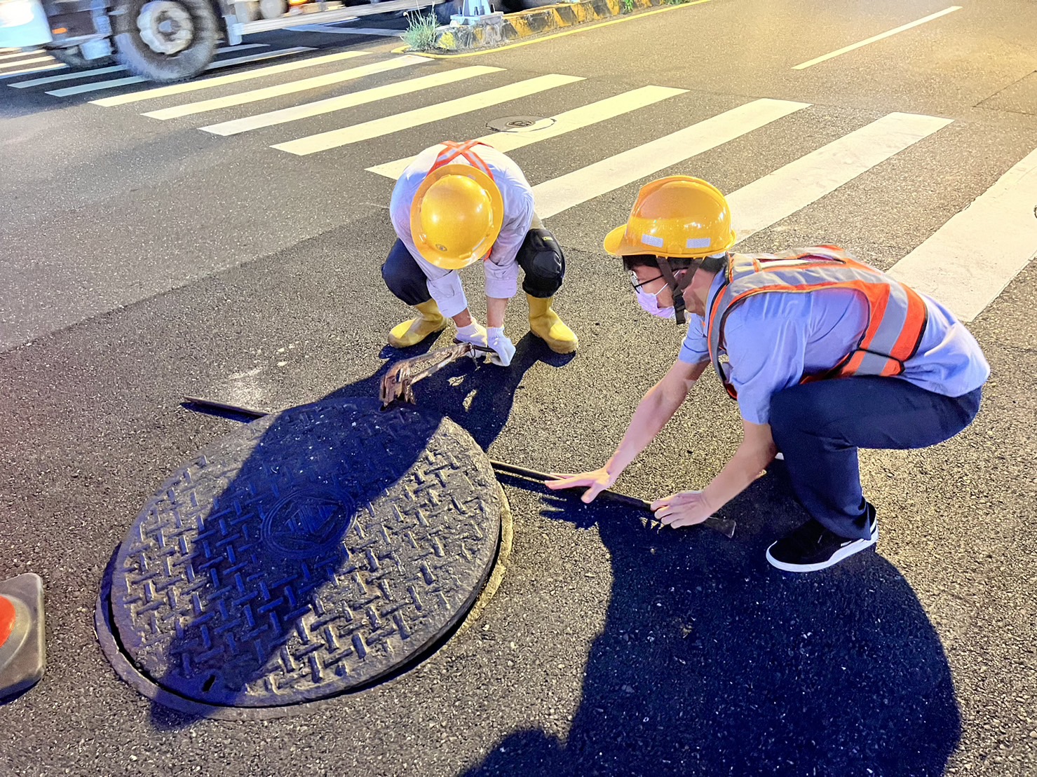 臺南市安平區育平路與府平路路口處昨(22)日下午4點左右出現下陷狀況,水利局接獲通報立即抵達現場勘查。(台南市政府提供)