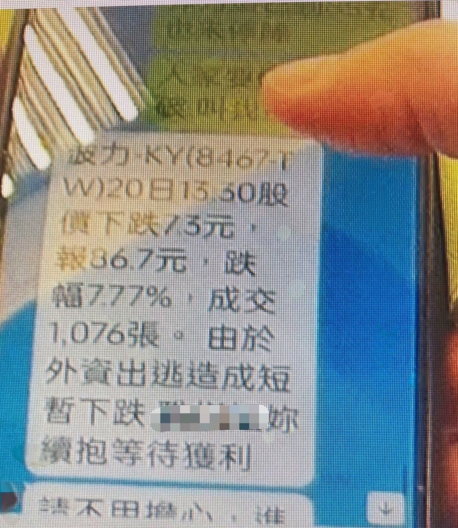 警方表示,警員艾子瀚、彭穩達到場詢問後,詹婦表示日前接到一名Line暱稱「小威」的男子加其好友,起先係以報股票明牌取得婦人信任;不久後,這名男子便慫恿詹婦讓其代為操作股票,並保證獲利,詹婦一時不察便至銀行提領現金新台幣60萬元準備交付。