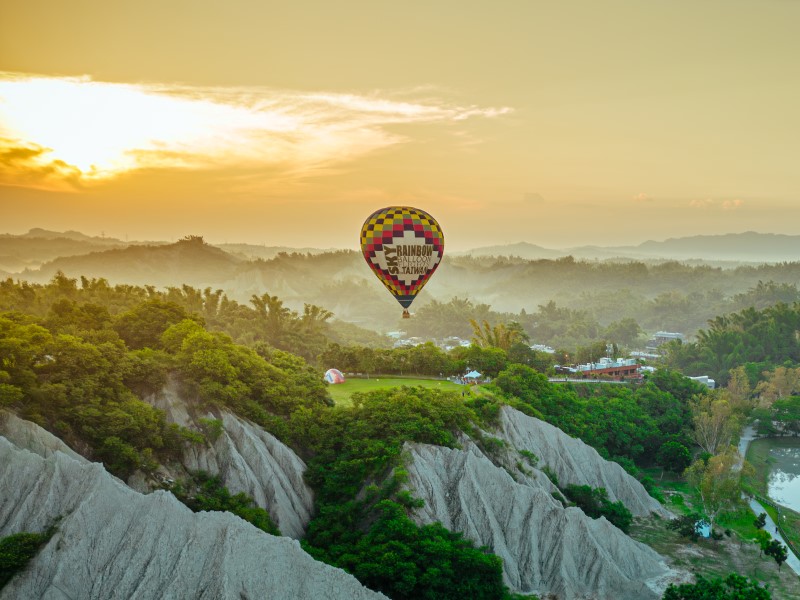 月世界雲騰霧繞的山嵐美景與熱氣球共築美麗風景。(高雄市政府觀光局提供)