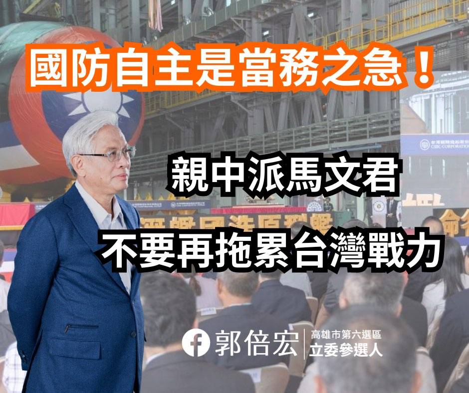 針對國造潛艦下水增強國軍戰力,郭倍宏不忘提醒國人,面對中國日益增長的威脅與野心,國防自主是當務之急。郭倍宏說:對於馬文君這種表面監督、實則搗蛋的「中國同路人」,我們絕對不能再投給她。有關她是否涉及洩漏國家重大軍事機密?相關單位應該速查、詳查、嚴辦,若真有賣國之實,此等國賊,必須嚴懲!