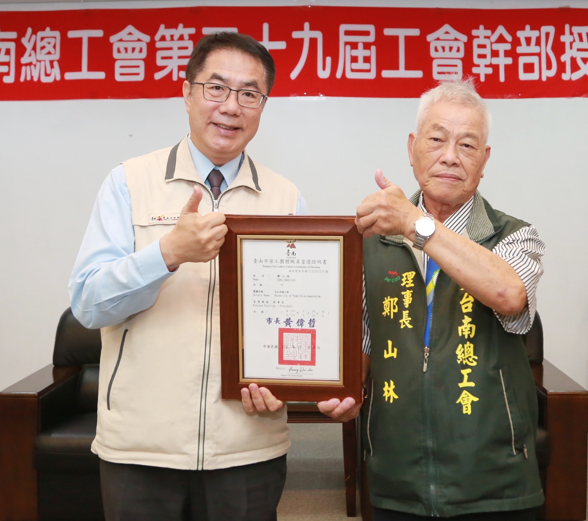 (記者李麗華報導)大臺南總工會今(3)日舉辦「大臺南總工會第29屆理事、監事」幹部授證典禮,由黃偉哲市長頒發當選證書,同時也頒發「做工行善十週年」匾額,感謝大臺南總工會及「做工行善團」長期幫助弱勢勞工家庭改善居住環境,協助市府逐步實現「希望家園」的願景。