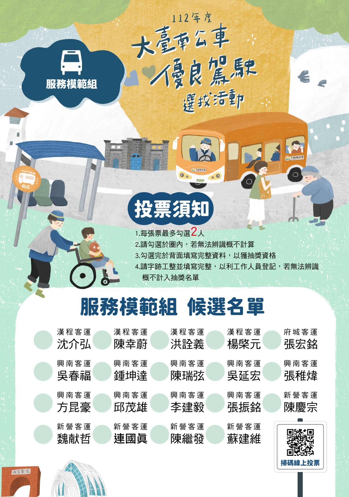 公共運輸處處長吳俁之說明,投票方式可至本市各大轉運站(台南轉運站、新營轉運站、火車站南北站、新化站、佳里站、玉井站、新營站、麻豆站、白河站及關廟站等)以紙本票卡圈選或掃描活動海報上的QR code填寫Google表單(https://forms.gle/CboRmBQ6JpH31YR67)。