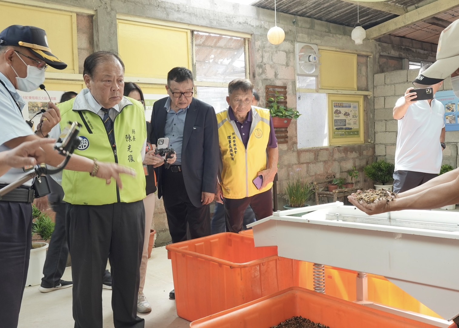 澎湖縣長陳光復(左三)出席「黑水虻示範養殖場啟用典禮」時表示,透過黑水虻能將農業廢棄物轉變成有用的動物飼料蛋白質特性。(澎湖縣政府提供)