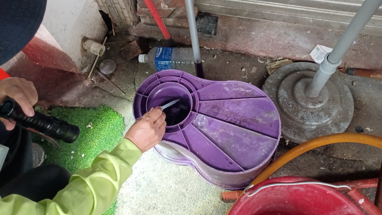 防疫團隊今日進行高風險社區環境病媒蚊密度調查共計查獲171個積水容器,其中37個已孳生病媒蚊孑孓,防疫人員現場已開單告發並清除,孳生源樣態為塑膠罐、水桶、花器、各式底盤、塑膠布、拖把桶、澆花器等。衛生局籲請各公私場域所有人、管理人、使用人,主動進行環境整頓,移除髒亂堆積物並清除積水處,如未主動積極清除孳生源,經查獲孳生病媒蚊幼蟲,最高處新臺幣15,000元罰鍰。