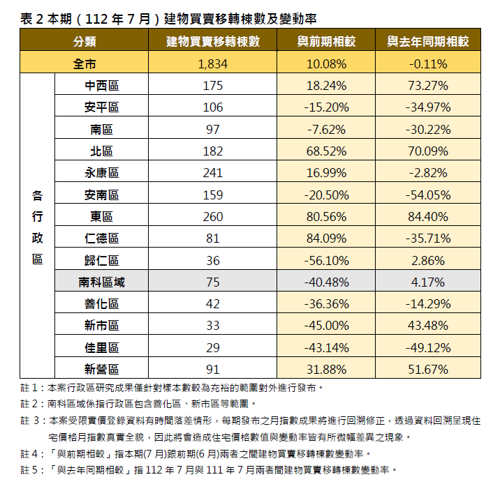 地政局長陳淑美表示,今年上半年總體經濟景氣仍趨疲軟,至112年7月止,經濟景氣已連續10個月出現藍燈,再加上平均地權條例子法規於七月實施之影響下,臺南市整體住宅市場已進入盤整期,呈現價穩量縮情形。本期住宅價格指數微幅上漲,建物買賣移轉棟數方面,全市總體交易量與近年同期相較皆呈現下滑趨勢,經統計本市7月建物移轉棟數共計1,834棟,較前期(6月)增加10.08%,較去年同期減少0.11%。此情形顯示今年房市上半年以來,受到經濟景氣疲軟,打炒房政策持續發酵,6月成交量最低,7月稍有提升,但仍少於去年同期。