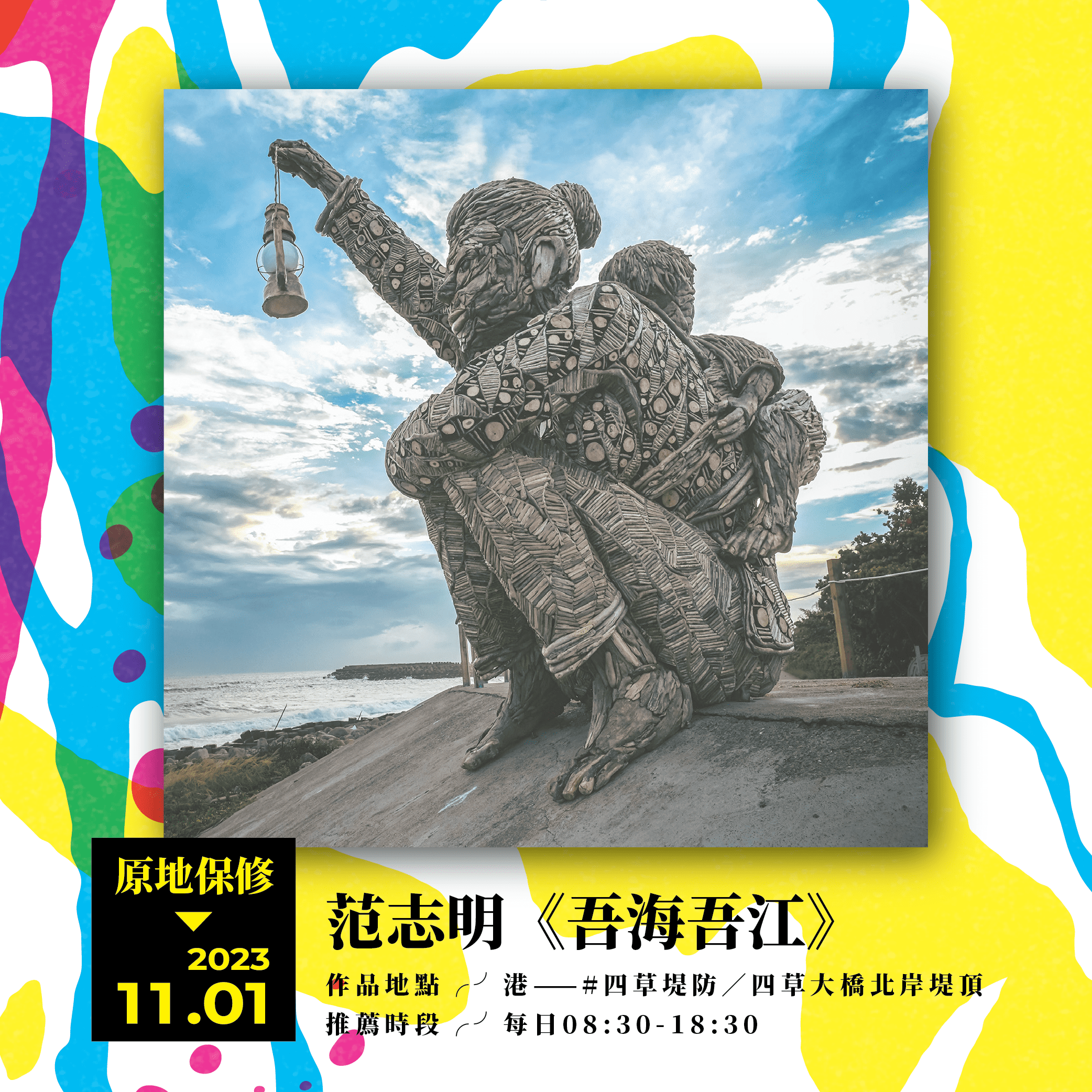 台江建庄二百年「開江紀」藝術裝置大展,已於本(10)月1日正式結束,但許多民眾對各展品卻是依依不捨、不忍道別,尤其俗稱「台江阿嬤」的作品《吾海吾江》,即便位在較遠的四草堤防也不減其高人氣。為使全國民眾有更多機會一睹「台江阿嬤」風采,未來一個月將採原地保修的方式,陪伴大家共度雙十連假。