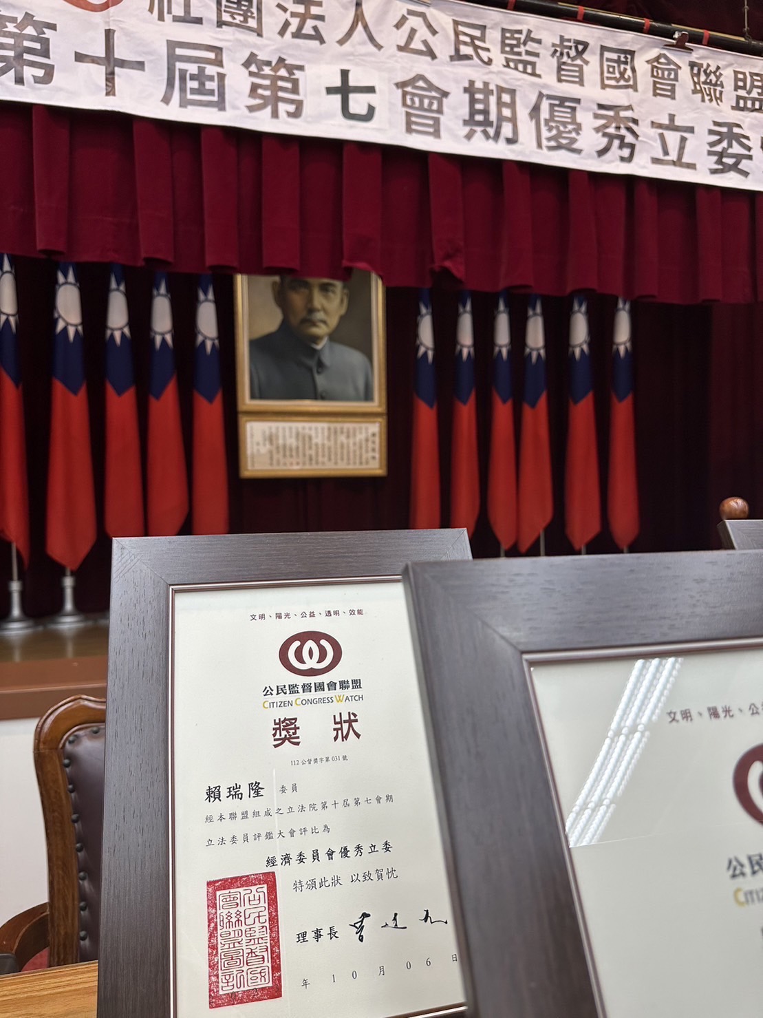 公民監督國會聯盟舉辦第十屆第七會期優秀立委頒獎典禮,立委賴瑞隆獲評選為經濟委員會優秀立委。(立委賴瑞隆辦公室提供)