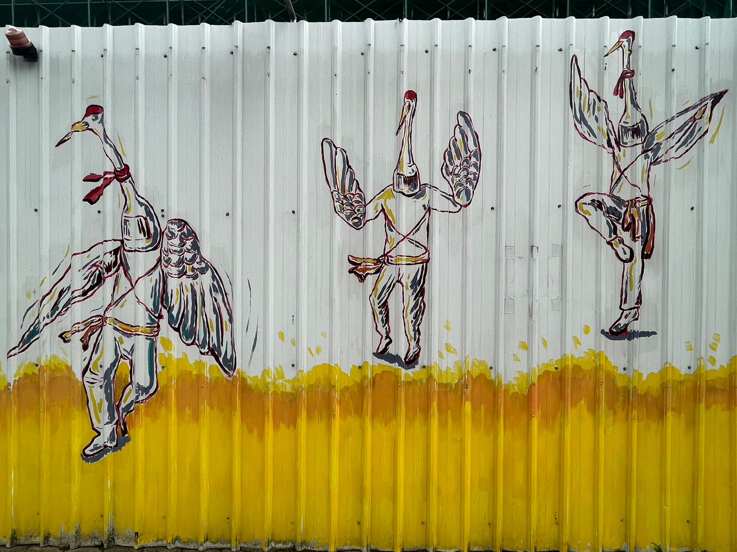 (記者李麗華報導)成功路赤崁文化園區的施工圍籬,近日悄悄地披上繽紛多彩的藝陣圖像。長達70公尺的工程圍籬,藉由文化局特別邀請的年輕藝術家蔡濰任之手,畫上「宋江陣」、「金獅陣」、「白鶴陣」、「鬥牛陣」、「牛犁歌陣」以及「十二婆姐陣」等臺南市登錄為無形文化資產的民俗藝陣。