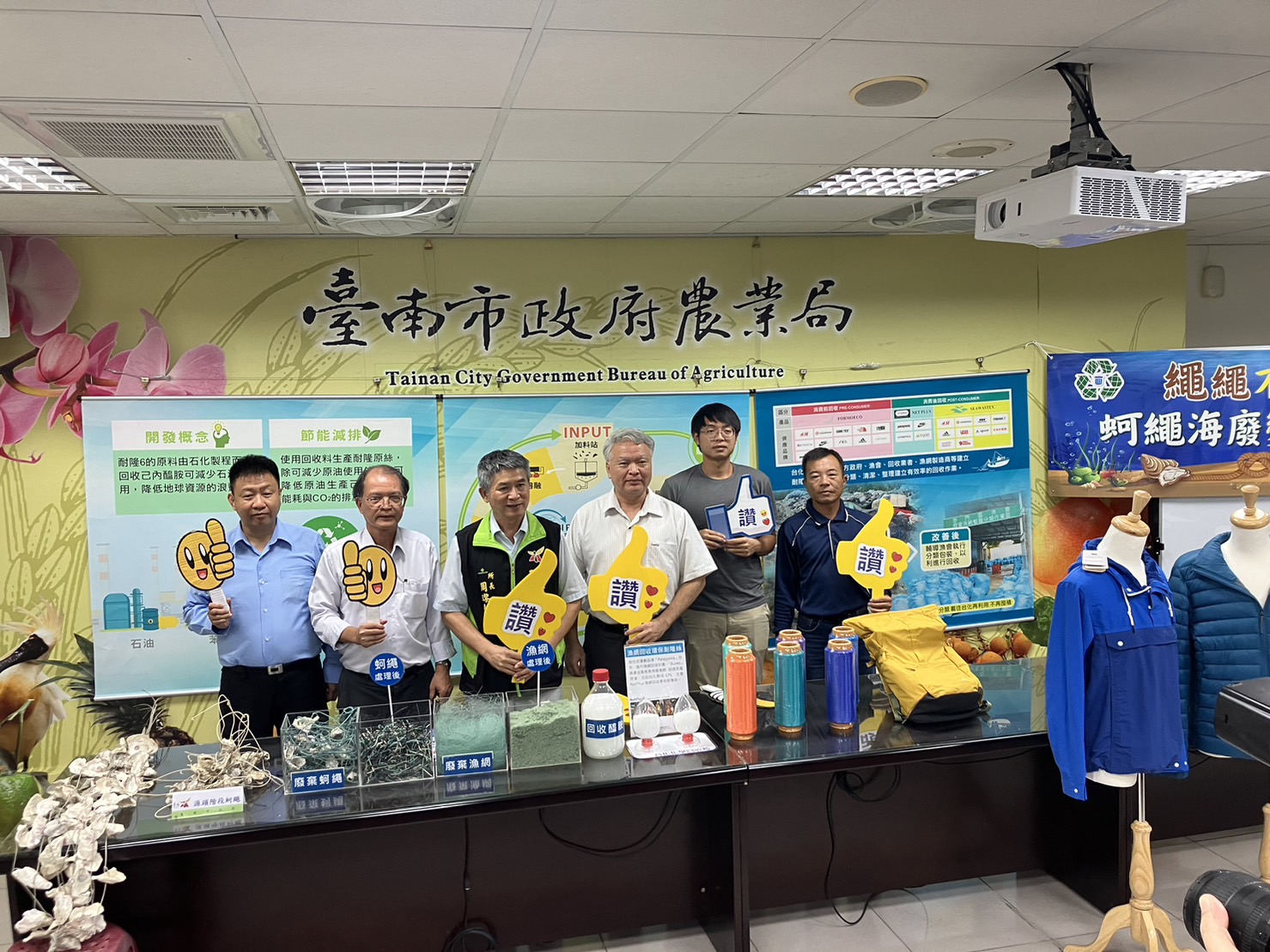 黃偉哲指出,臺南地區牡蠣養殖所用之蚵繩屬尼龍材質,臺南市政府今年接受海洋保育署委託回收7000公斤,以每公斤最高15元鼓勵漁民回收,以消除對環境之污染,並由本局委託廠商將蚵繩作初步前處理後,再交由臺灣化學纖維股份有限公司進行高值化再利用,製成環保機能服飾等民生用品。