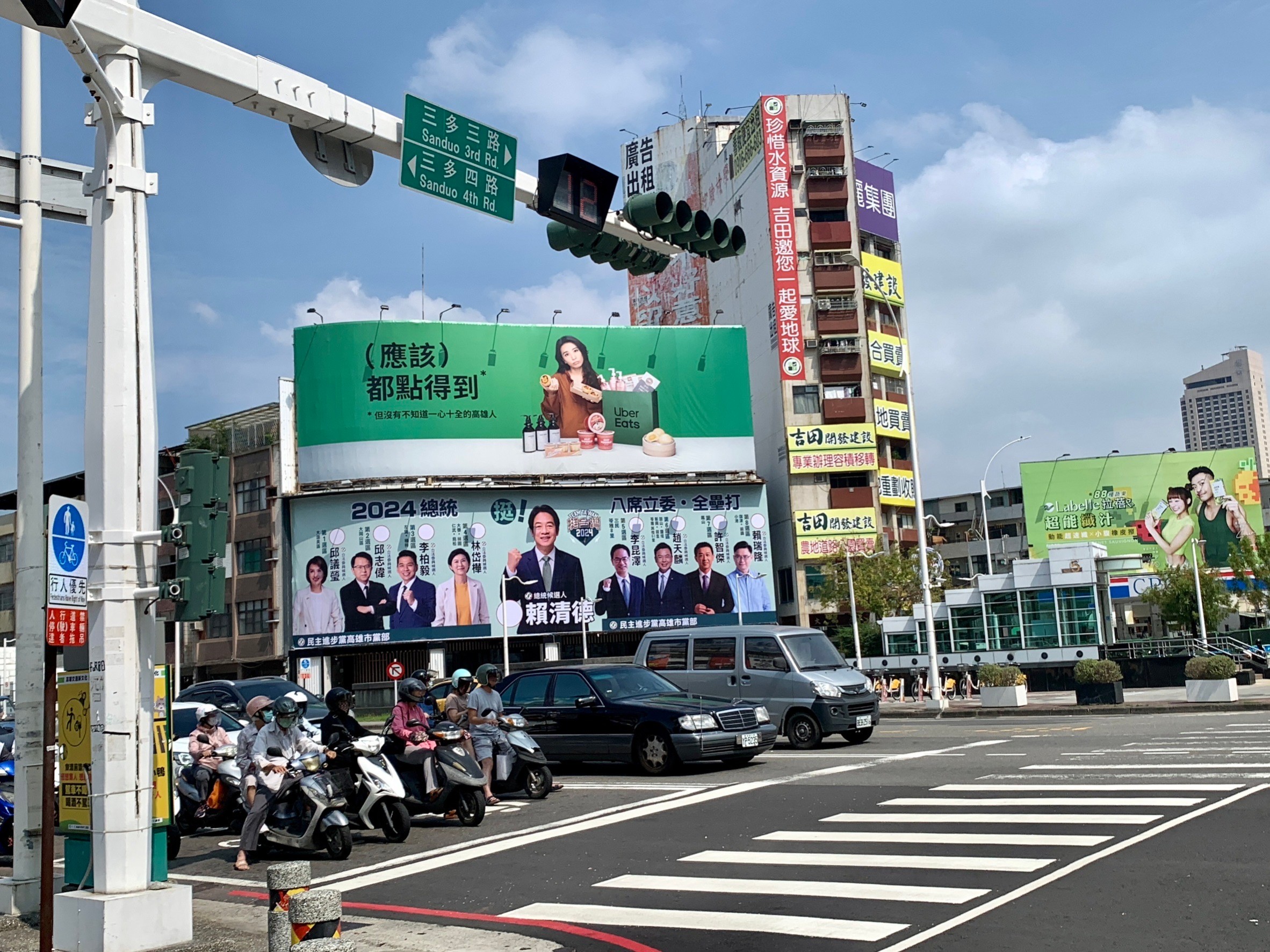 民進黨總統候選人賴清德及高雄八位立委候選人的聯合看板,繼北高雄之後,今(21)日懸掛南高雄的中山路、三多路大路口,巨大的橫幅,格外醒目!