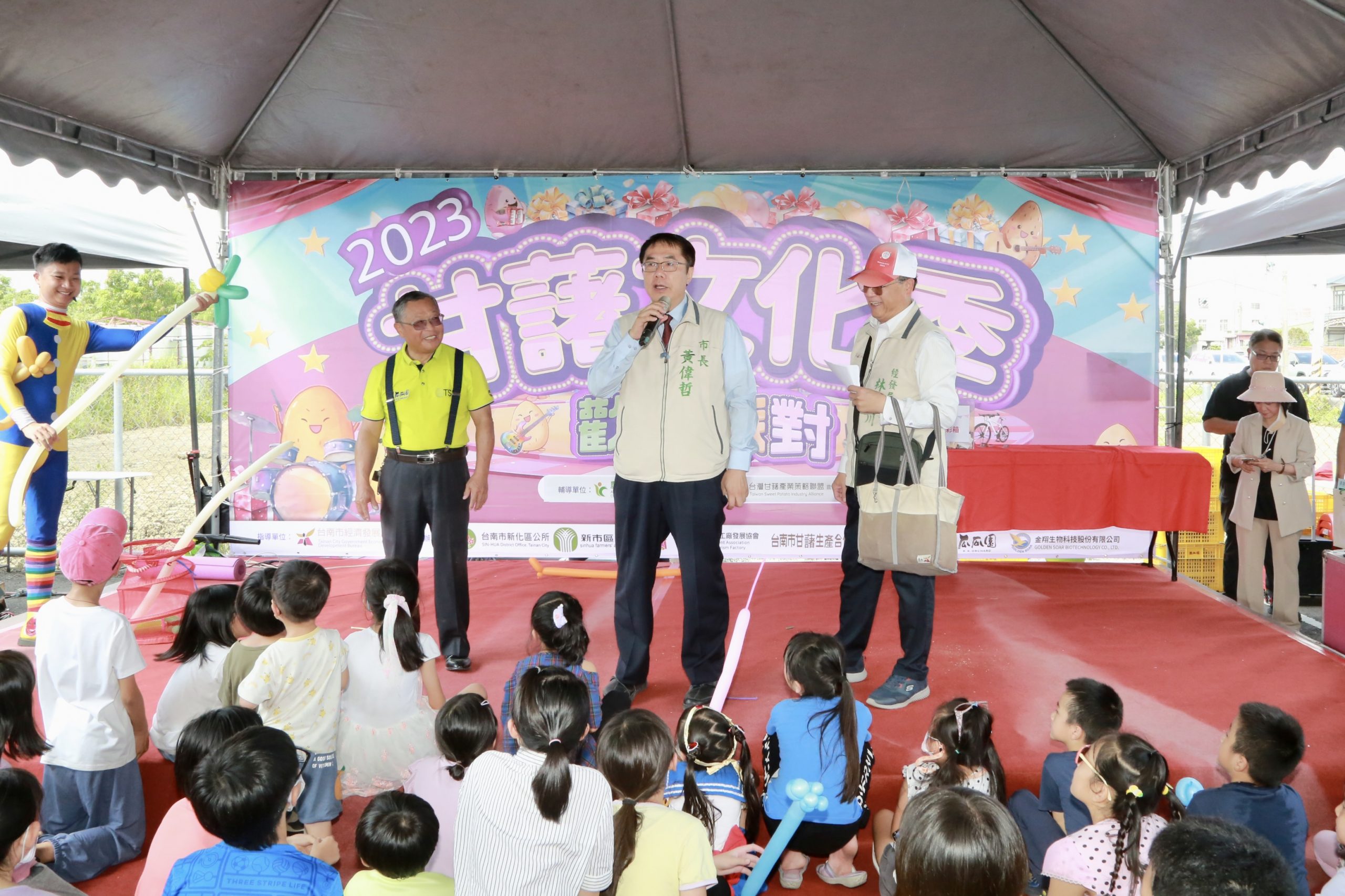「2023 甘藷文化季」在瓜瓜園地瓜生態故事館廣場開幕,台南市長黃偉哲(前中)受邀到場共襄盛舉。(台南市政府提供)