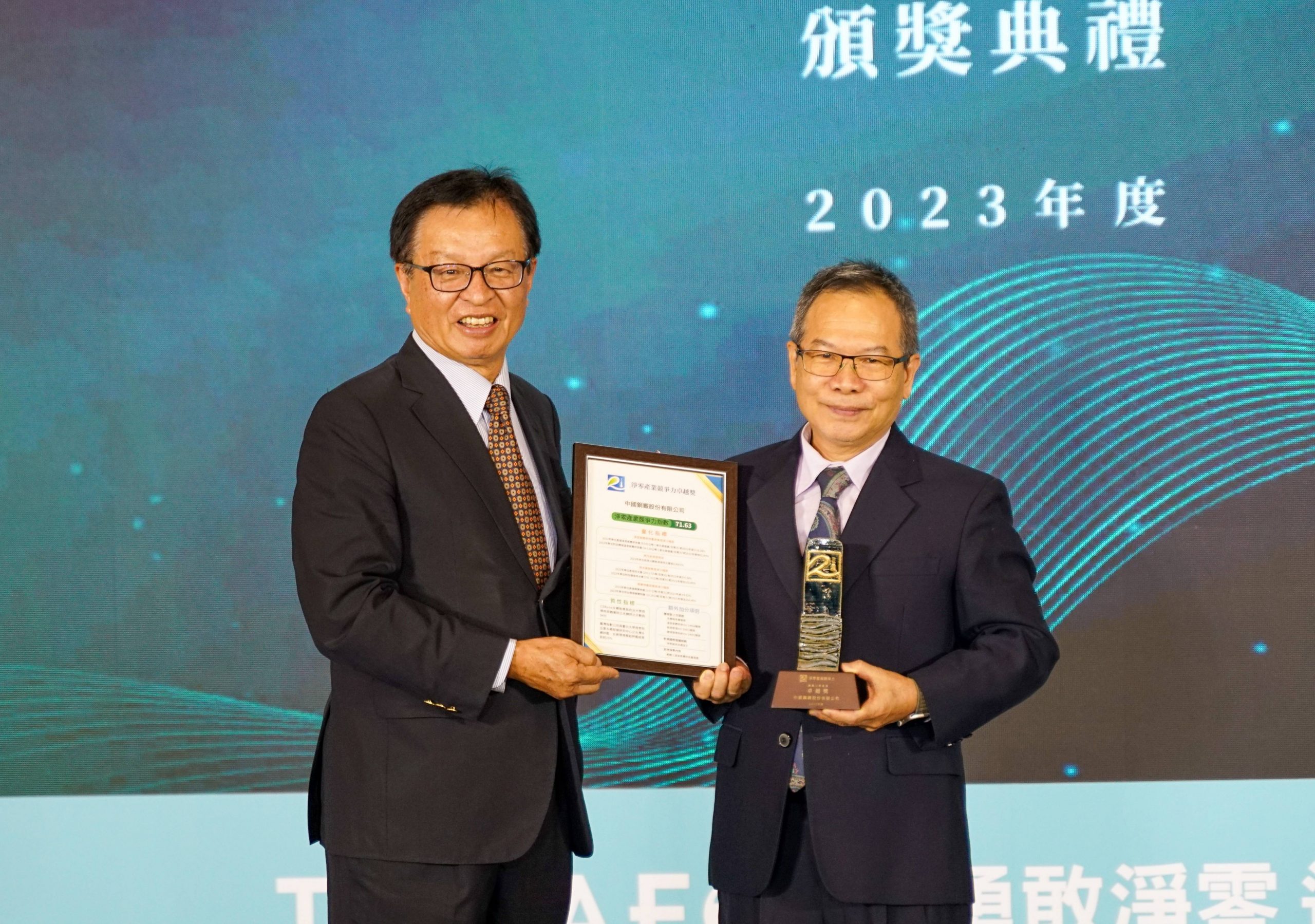 財團法人二十一世紀基金會邀請中原大學榮譽教授林聖忠(左)頒發淨零產業競爭力卓越獎,中鋼公司生產部門助理副總經理許澤位(右)代表領獎。(中鋼公司提供)