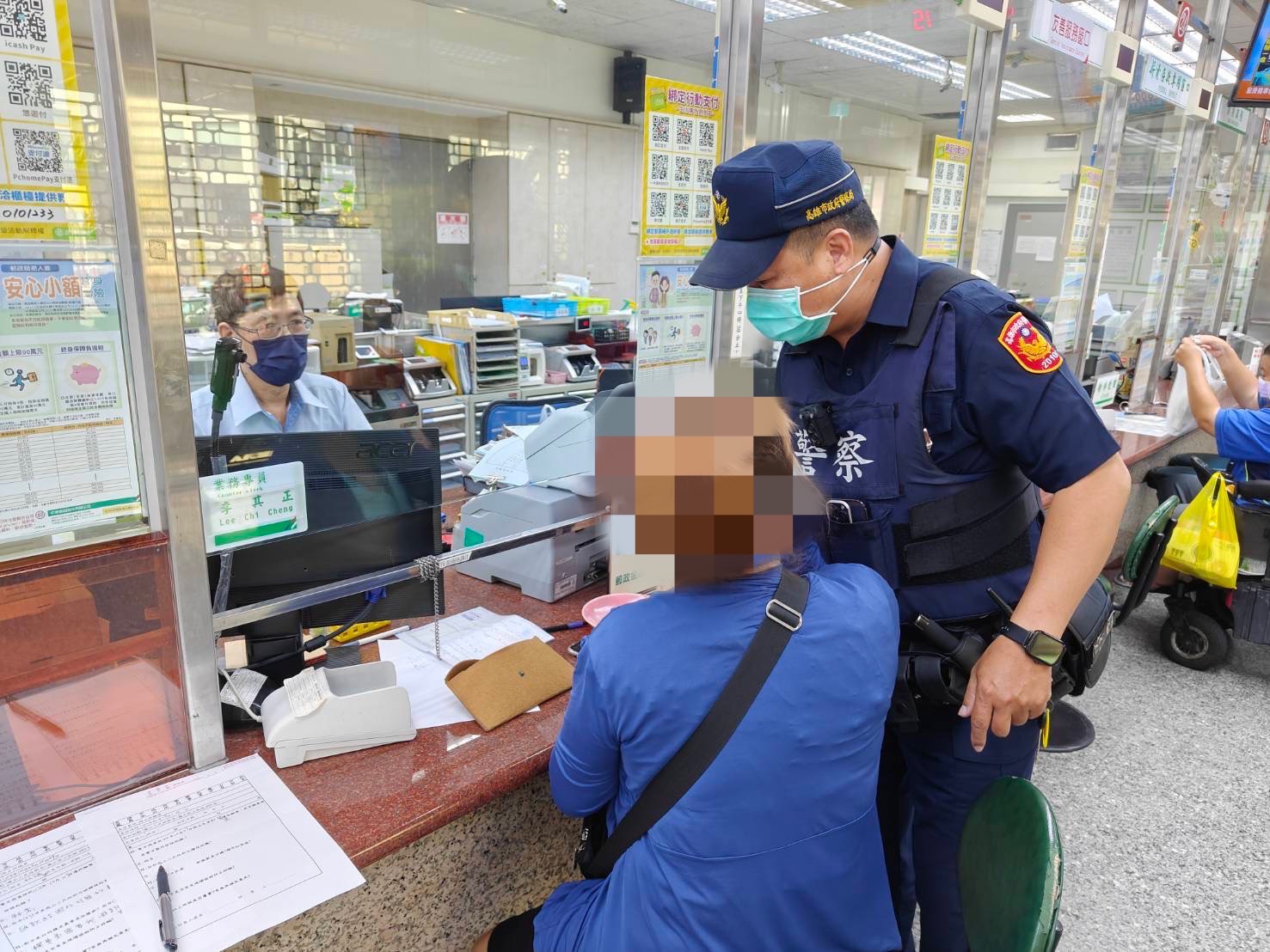 婦人前往鳳山區三民路郵局,手一把抓著新臺幣10萬元欲辦理匯款,行員機警察覺有異,故通報鳳崗派出所警方到場了解。(高雄市鳳山警分局提供)