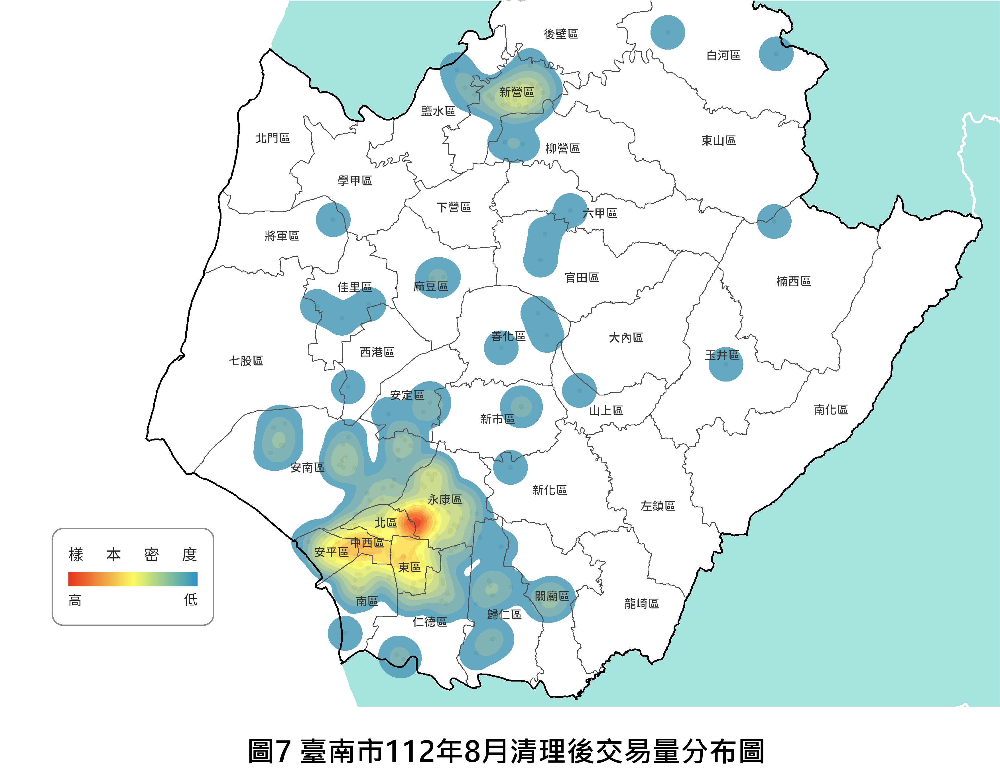 進一步觀察各行政區交易量表現,行政區間交易量前三名分別為北區(404棟)、東區(314棟)及安南區(295棟),與前期(7月)相比,市中心區域的交易熱區以新市區、北區、仁德區增加較多,本期交易量皆有逾九成的增幅,反觀中西區則減少21.71%。南科區域總體移轉棟數與前期(7月)相較呈現上升趨勢,尤其新市區價量俱漲,新市區交易量增加290.91%,善化區增加33.33%。觀察本期各行政區移轉棟數逐漸回溫。本期住宅市場價格微幅上揚,交易量呈現上漲趨勢,而各行政區次市場亦受到各重大開發計畫影響而有不同變化,有關詳細住宅價格指數資訊,將公佈於本府地政局官網。