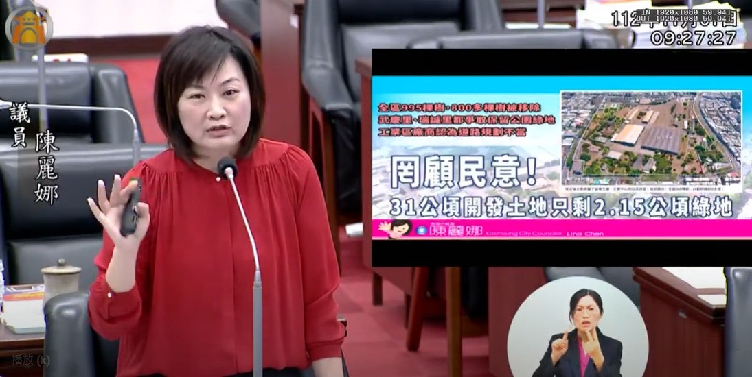 陳麗娜今天質詢都市計畫委會,指出配合鐵路地下化,高雄機廠在2013年搬遷到屏東潮州,原本在鳳山廣達31公頃的舊廠區,台鐵計畫開發再利用。由於高雄市府提出的計畫案,讓綠地變得破碎。