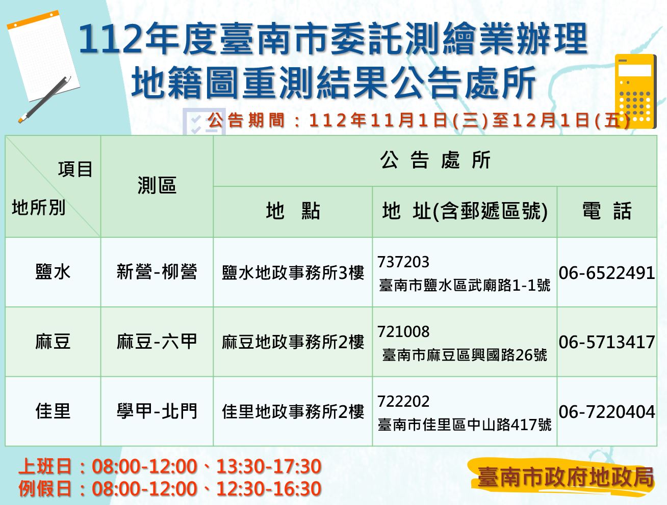 (記者魏正賜報導)112年度臺南市委託測繪業辦理地籍圖重測將於11月1日起至12月1日止辦理結果公告,公告期間可至土地所在地之地政事務所公告場閱覽重測結果,平日服務時間為上午8時至12時及下午1時30分至5時30分;例假日服務時間為上午8時至12時及下午12時30分至4時30分。市長黃偉哲提醒,所有權人可攜帶重測結果通知書及身分證,踴躍前往公告場閱覽重測結果,確保自身權益。此外,重測結果通知書將以郵局掛號方式寄發予土地所有權人,屆時請土地所有權人多加留意。
