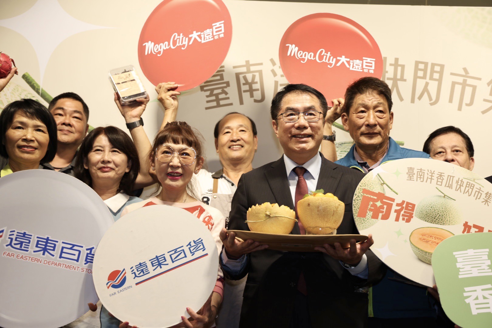 台南市長黃偉哲表示,台南的洋香瓜品種繁多,有綠皮、黃皮,脆肉、軟肉,有外表是網狀的,也有外表平滑的,雖然有這麼多種類,但共同的特點就是非常好吃,甜度可達到18度,可以說甜到出汁。因此今天帶著台南最好的洋香瓜,來到全國最優質的消費市場板橋大遠百,要跟北部的消費著分享台南最好的壓箱寶洋香瓜。