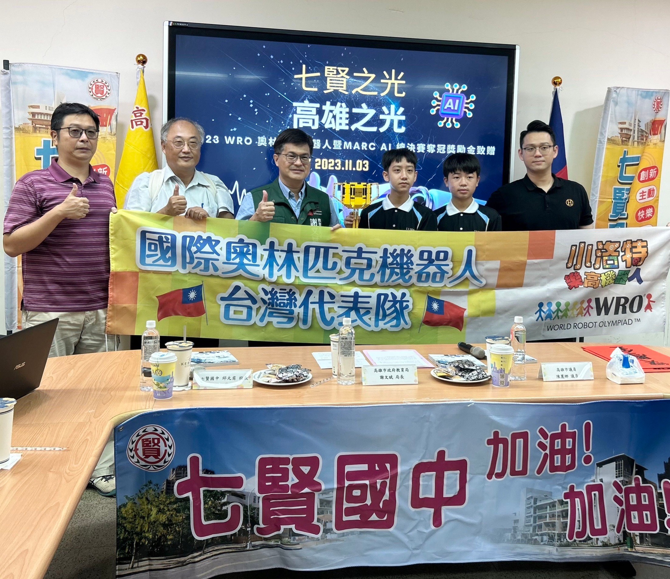 高雄市教育局長謝文斌也特別在選手赴國外參賽前,到七賢國中為參賽選手吳梓睿、邱兆璿同學加油打氣,並且頒發獎學金、獎勵金,表示教育局鼓勵更多學生參與機器人、人工智慧領域的學習與研究,鼓勵參賽選手面對挑戰展現實力,取得最佳成績,為國爭光。