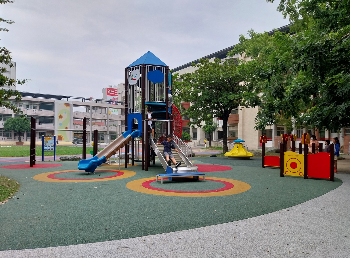 大成國小數學共融遊戲場以數學遊戲為發想,用學生熟悉的數學教具來設計遊具,「索碼方塊」遊戲塔以顯目的顏色色塊,將方塊堆疊高低不同的平臺,高平臺溜滑梯強調刺激性,低平臺溜滑梯則適合低年級或行動不便學生;「空間大師積木」攀爬網可挑戰兒童的肌耐力、肢體協調、空間感等,強化學生肢體運動能力;「分數板旋轉盤」更可提供坐輪椅學生遊玩,小朋友以互助協力方式旋轉遊具,一起感受離心力,維持身體平衡。遊戲場鋪面則以人工草皮鋪面,方便輪椅通行,符合無障礙精神。