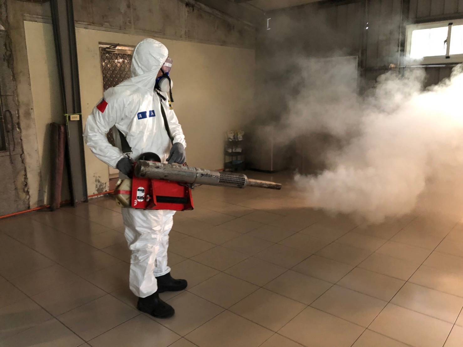 防疫人員進行個案居住地及工作地戶內外化學防治作業。(臺南市政府衛生局提供)