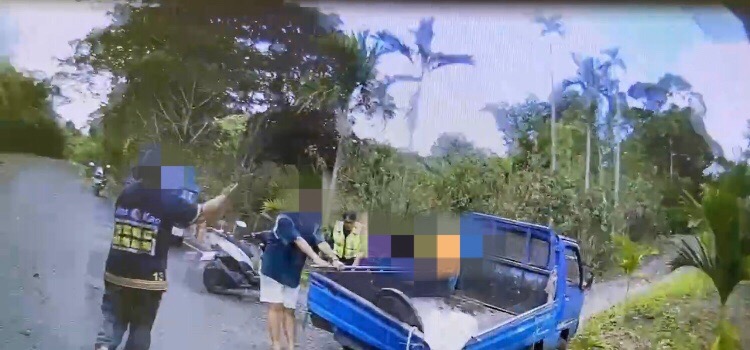 高雄那瑪夏區6旬高姓婦人,今(11)日12時許,駕小貨車水蜜桃園務農時,因產業道路狹窄,一時失去動力,後輪不慎滑落山溝,動彈不得,由於位處偏僻山區,附近人煙稀少,幸遇那瑪夏分駐所所長鍾易修、警員林清海巡邏途經該處,鍾所長現場評估狀況,先以石頭、磚塊抵住輪胎,避免再次滑落,並與民眾徒手搬車,協助貨車脫困,高婦非常感謝警方主動協助。