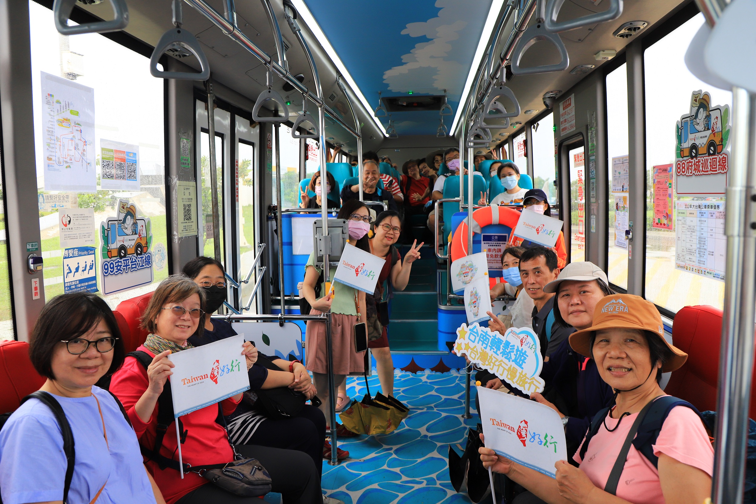 市長黃偉哲表示,今年台南首次登場的台灣好行主題彩繪車,打造「車上就是景點」,一上車就能感受到台南景點魅力,88府城巡迴線因行經府城內古蹟景點,且因應即將到來的臺南400,結合其主視覺,作為臺南400主題形象宣傳車,火紅的車體內裝讓人一上車就感受臺南滿滿的熱情;99安平台江線則是取運河、四草竹筏及黑面琵鷺的生態特色,巧妙結合救生圈於公車後段的點綴,將公車椅套也換成四草竹筏船體顏色,帶給遊客另一種新奇的搭乘體驗!山博行線則是以串聯近山區3大博物館的特色意象,包含臺南左鎮化石園區的恐龍化石、臺南市南瀛天文館的星空及臺南山上花園水道博物館的建築,以繽紛童趣的色系,強化親子共學路線特色,開心遊台南外,還能欣賞獨家設計主題彩繪車。