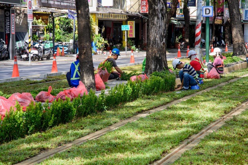 捷運施工團隊開始陸續在輕軌路廊種植草皮及綠籬。(高雄市政府捷運工程局提供)