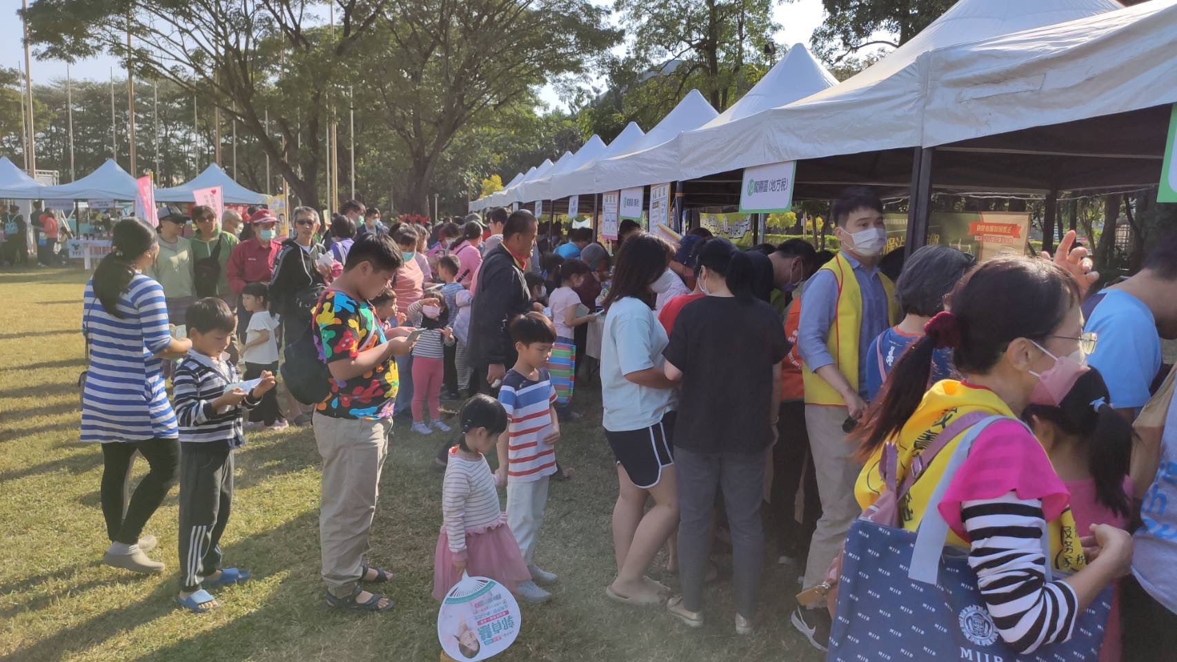 南市政府財政稅務局新營分局與財政部南區國稅局新營分局合署辦公後,再度合體在新營體育場228紀念公園舉辦「雲端發票好運來〜親子樂活踏青趣」。(台南市財政局提供)