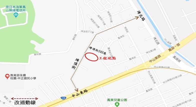 新建工程處進一步指出,工程開工後將採封閉施工,屆時請當地民眾利用埤北路、中山東路依改道路線行駛,施工過程也會督促協助廠商掌握品質進度及工安,如期如質完成。市府在工務建設的推動上近來持續努力,並在鳳山區積極推動各項工程建設,並陸續完成「鳳山頂庄一街銜接寶陽路橋」、「鳳山區中崙路西段拓寬工程」、「鳳山區過勇路改善工程」;另外「鳳山區五權路開闢工程」及「鳳山區過埤路北側車道改善工程」刻正施工中,將提升鳳山地區交通路網系統,完成社區安全及永續生活品質。