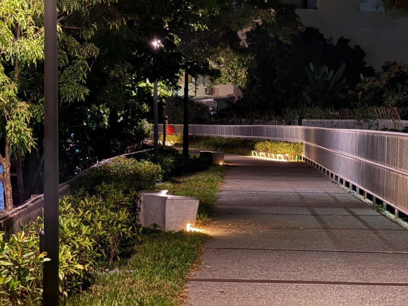 國中東側已經開放的水綠步道,也適當的補足植栽與照明,更增添休閒散步的舒適。(臺南市政府都市發展局提供)