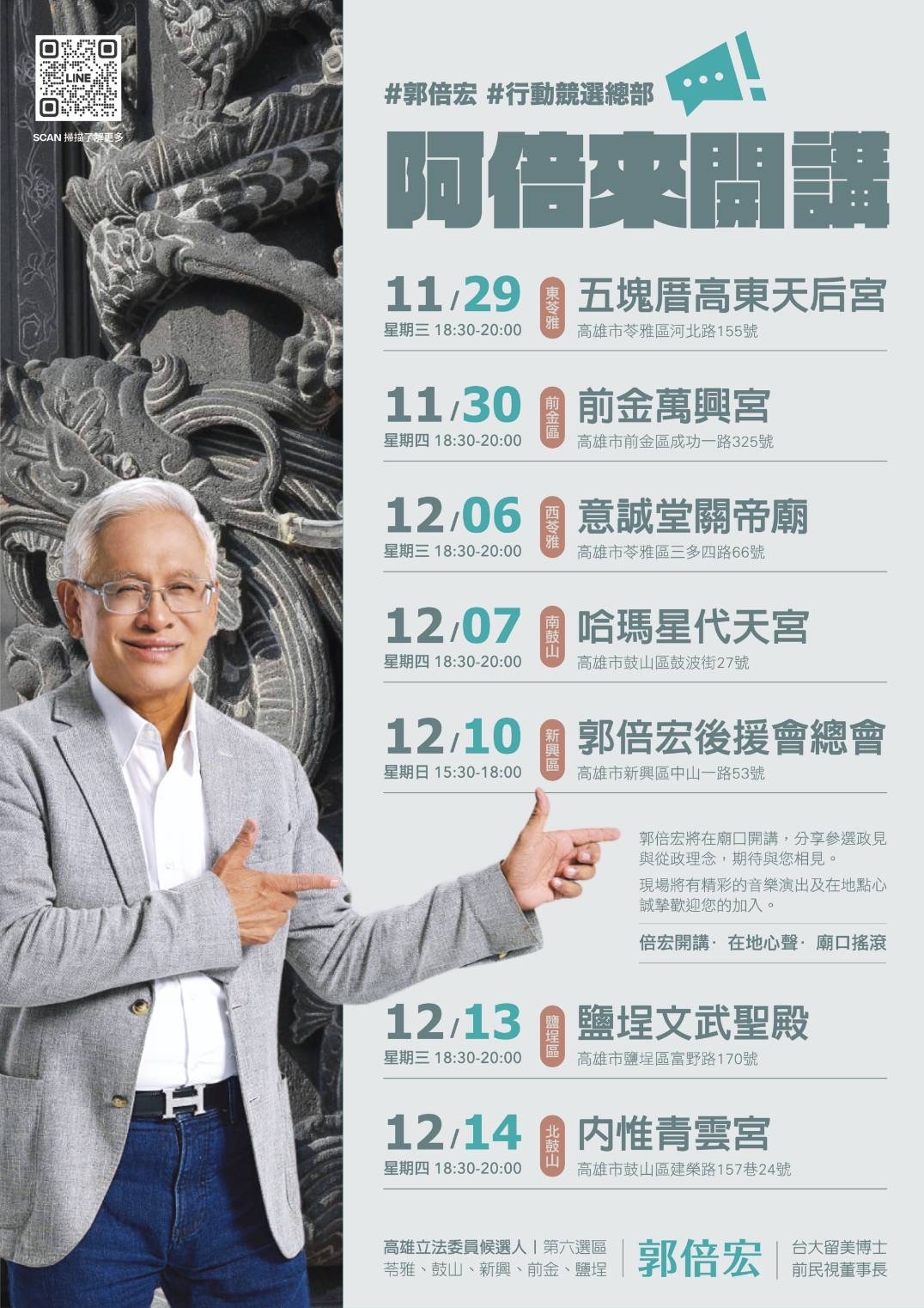 至於自己選區同樣被視為全國73個區域立委選情中最熱的主戰區,面臨藍白破局的情況下會有何影響?郭倍宏說,高雄市第六選區的立委選情由於民、國兩大黨的高層介入,蔡總統已來了數趟,賴副總統更來了五、六趟,國民黨的韓國瑜也來站台,這些動作都已使得這一區成了全國立委選戰中的最主要戰區,三人競逐,究竟誰會贏?郭倍宏表示,他相信腳踏實地,一步一腳印走遍各區,讓選民了解他的政見與主張才是勝選的關鍵。藍白合不合?對他的選情沒有影響,儘管其他兩位對手都有龐大的政黨或派系的奧援,但他始終深信,決定勝負者是選民,郭倍宏對自己終將勝選仍持有高度的信心!