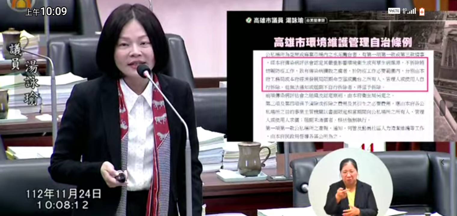 湯詠瑜也促請市府解決前金區登革熱問題,她說,前金區染疫足跡集中自強市場,過去為市場用地,目前已停用,內部環境髒亂,衍生公共衛生危機,她要求市府依高雄市環境維護管理自治條例規定,要求所有權人限期改善,逾期逕行處置。