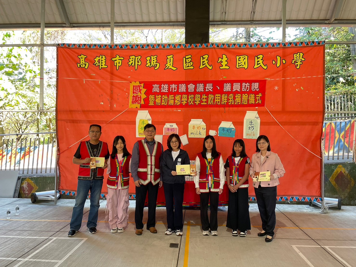 康裕成在陳幸富、高忠德及范織欽議員陪同下,先後前往那瑪夏區民生國小、桃園區建山國小及茂林區多納國小,代表企業和民間善心將飲用鮮乳捐贈給原鄉學童。