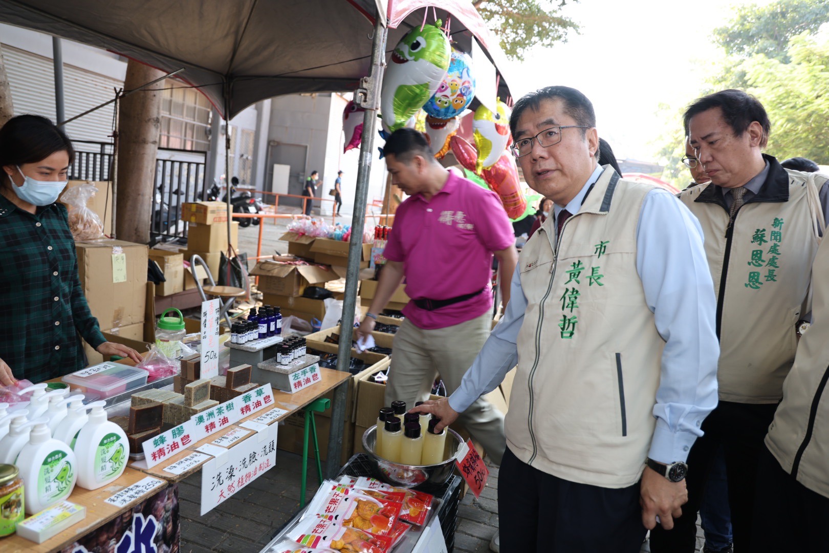 市長黃偉哲到場逛各類美食、文物攤販,並發送糖果給現場小朋友,場面熱絡。黃偉哲指出,台南購物節獎品非常豐富,歡迎大家來台南購物抽大獎。本次活動設有60個市集攤位,包含眷村美食及台南在地小吃,提供市民朋友品味在地美食及購買年節伴手禮的好機會。