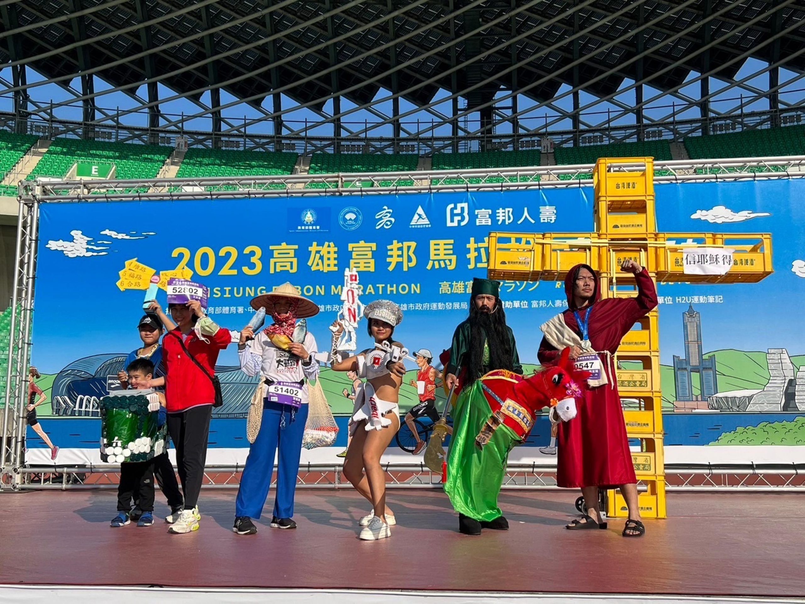 (記者李麗華報導)高雄市政府運動發展局主辦、富邦人壽冠名贊助的「2023高雄富邦馬拉松」,今年以「RUN AHEAD RUN BEYOND 向前超越 」為口號,活動首日,由3.5公里休閒組打頭陣,不少爸爸媽媽帶著小朋友共襄盛舉,在高雄市政府運動發展局局長侯尊堯偕同富邦人壽陳世岳總經理鳴槍後,熱鬧開跑;緊接著是超吸睛的恐龍變裝競速賽於國家體育場田徑場舉行,民眾穿著暴龍服裝拔腿狂奔,衝刺終點,不只比搶鏡,還要比速度,可愛又好笑,把氣氛炒到最高點。