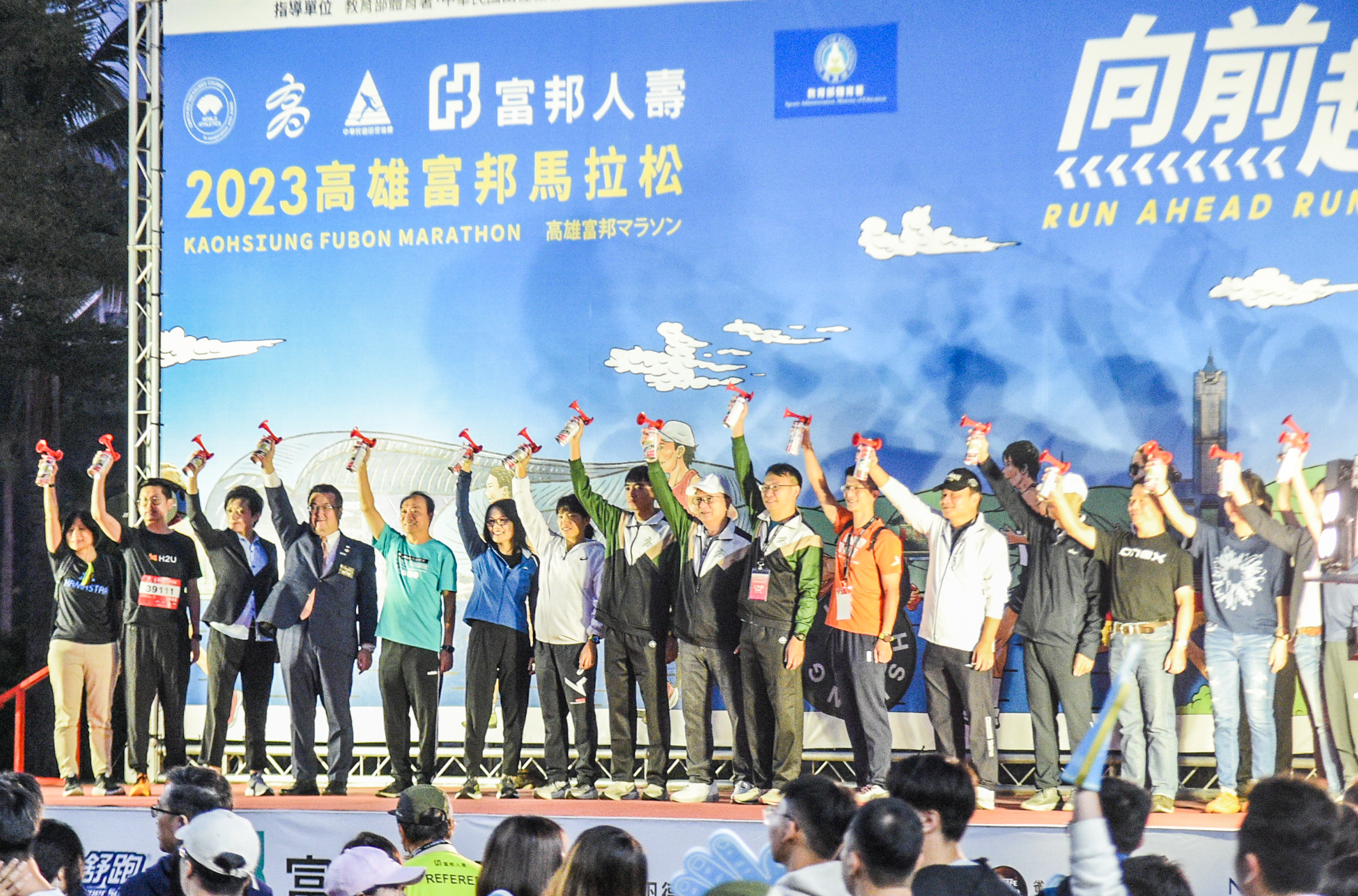 (記者吳冠賢報導)由高雄市政府主辦、富邦人壽冠名贊助的台灣年度馬拉松賽事「2023高雄富邦馬拉松」,於11月26日清晨5點20分在高雄世運主場館盛大開跑,賽事主題以「RUN AHEAD RUN BEYOND向前超越」為主題,希望所有人持續邁進,突破自我。為鼓勵多元族群參與,今年持續推動運動平權,設有競速輪椅組、運動輪椅組,今年視障組更採男女分組,讓視障者擁有跟ㄧ般組同樣的參賽權利。也讓高富馬成為全臺馬拉松界的榮耀,打造高雄成為運動友善城市,本次賽會也邀請到健康有活力的Fubon Angels啦啦隊為活動暖身揭開序幕。